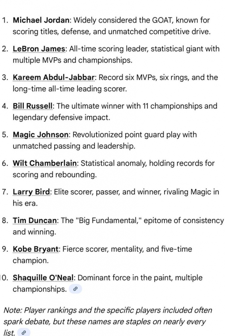 Chat GPT列出的历史前十分别是:乔丹、詹姆斯、贾巴尔、比尔·拉塞尔、魔术师约翰逊、张伯伦、拉里·伯德、邓肯、科比、奥尼尔。